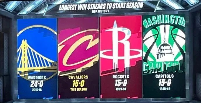 在NBA历史上,只有4支球队开局15+连胜:2015-16赛季,勇士,24连胜;1993-94赛季,火箭,15连胜;1948-49赛季,华盛顿首都,15连胜;2024-25赛季,骑士,15连胜(还在继续)。